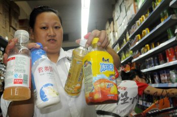 | 在世纪联华南国店,工作人员在整理货架时发现很多饮料被人偷喝,留下许多空瓶子。文广 摄 |