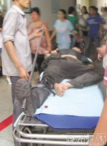 受伤的工人姓杨,来自重庆,今年40岁,在温州龙湾永中一家钢管厂上班。昨天,记者在温州医学院附二医急诊室看到,杨师傅脸色煞白,满头大汗,他左脚的鞋子已经脱去,右脚穿着一只厚厚的黑色胶鞋,床单上血迹斑斑,一根长约1.2米、直径2厘米的空心刚管从其脚背插入,穿过脚心,露出10厘米左右在外。