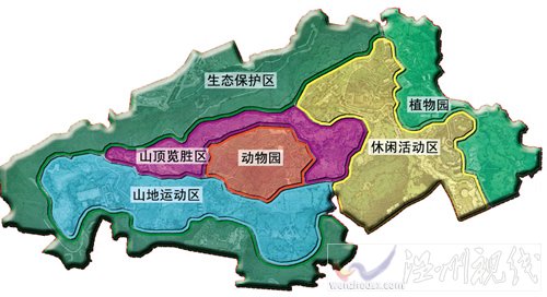 经过重新梳理,规划提出以良好植物为依托,将景山森林公园设计为"二园四区",即温州动物园、温州植物园和休闲活动、山顶览胜、山地运动、生态保护四大区域。其中,休闲活动区结合现有沁春园、护国寺、气功疗养院等区域,开展观光、游览、休闲等主要活动。览胜区包含景山登高望远区块。山地运动区以登山、徒步穿越、探险、野营活动为主。此外规划还提出建设汇景、东瞻、山前、瓯浦等十大广场,桂花苑、银杏坡等15处自然景观和净水禅寺、护国寺等7处人文景观。