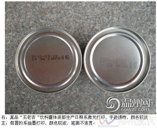 工商人员提醒,涉案假冒“王老吉”罐装凉茶与真品在口感上极为相似,且外包装也完全仿制真品包装,仅有细微区别:一是假冒“王老吉”凉茶味浓、口感较差、液体颜色较黑;二是封口拉环处,真品“王老吉”三字为激光雕刻,笔画清晰可见,字体背面无凹凸感,假冒的则是用字模敲打上去,笔画模糊、粗糙,字体背面有凹凸感;三是真品“王老吉”饮料罐体底部生产日期系激光打印,字迹清晰、颜色较淡,假冒的系油墨打印,颜色较浓、笔画不连贯;四是真品“王老吉”凉茶外包装箱的批次和易拉罐罐体底部的批次一致,而此次查获的假冒“王老吉”凉茶外包装箱上无产品生产批号。