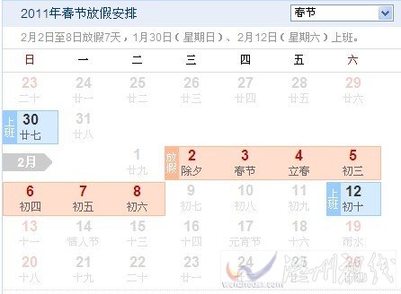 温州日报 根据《国务院办公厅关于2011部分节假日安排的通知》(国办发明电〔2010〕40号)规定,2011年春节放假时间为2月2日(农历除夕)至8日(正月初六),共7天。1月30日(星期日)、2月12日(星期六)上班(图中红色为假日,蓝色为工作日)。