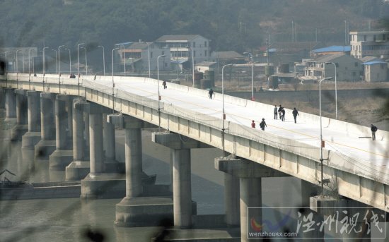 瓯江大桥于去年11月1日开始首次加固维修,预计工期4个月按期完成,2月28日重新开通。(瓯江大桥下月开始加固维修 施工期间禁止通行)昨天市民纷纷踏上瓯江大桥,提前目睹瓯江大桥投用26年来首次大修后的“新貌”。据了解,瓯江大桥的加固维修工程始于去年11月1日,主要包括桥面的修复加固、两侧防撞安全护栏浇筑。永嘉县公路管理段工作人员介绍,维修后的大桥长726米,桥面宽11.2米,2月28日重新开放。