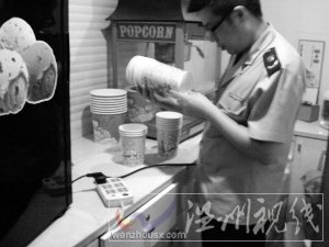 昨天中午,根据记者反映的情况,鹿城区江滨工商所工作人员来到新时代电影大世界一楼“时光咖啡”爆米花销售点,扣留了该店830个同一厂家生产的爆米花桶,并约谈了该店负责人。