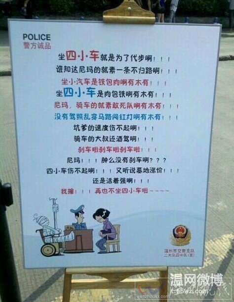 “坐小汽车是铁包肉啊!坐‘四小车’是肉包铁啊!‘四小车’啊伤不起” “爱超员,爱超速。爱装马达,爱闯红灯。爱无证驾驶,爱横穿马路。我们是四小车,不走寻常路。”……交警二大队的宣传牌运用网络流行的“咆哮体”、“凡客体”,结合生动形象的漫画,并安排了事故车现身说法,吸引了过往群众的眼球。
