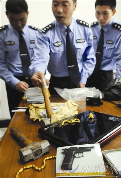 瑞安塘下金店被劫案,警方查获嫌犯作案时的榔头、手套、假手枪等工具,还追回一条金链,同时缴获嫌犯销赃后购买的数码产品。金鱼 摄