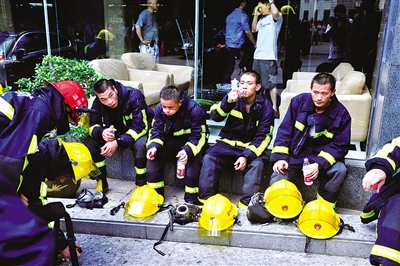 昨天温州新城大道救火现场,第一梯队的官兵下楼做休整。