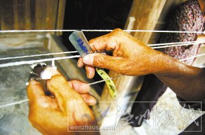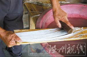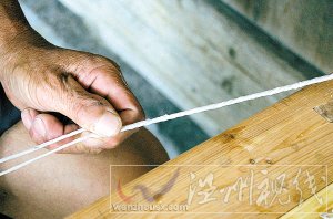 琴弦制作 牛筋弦整个生产过程主要有24道工序:取本地健壮黄牛背上牛排筋;剔除牛排筋上的肉;把牛筋放在砧板上敲捶;把牛筋上肉末泡洗干净;溶入配方和适量碱粉等;冲洗干净,去掉牛筋上的油质;晾干;把粗牛筋分瓣成一根根牛筋丝;把牛筋丝分成长条丝和短条丝;把牛筋丝粗细拉匀;以长丝为主线、短丝为副线揉搓成粗线条;绑在柱子上拉紧;定型后再拉成直线;用剃刀把牛筋线上的毛头、小结剃刮干净;取黄枝果煎成黄色碱水;取黄鱼鲛和黄枝果水浸泡牛筋线;浸泡10个小时后,取出洗净,再晾干;上釉和修坯;再次绑在柱子上绞紧;晾干水分,以防收缩;逐段严格查验,若发现毛结,再作加工;完工后即成牛筋弦,每根牛筋弦长3丈6尺,卷成一卷;在每根牛筋弦头尾打上出品印记,装进盒子,贴上标签和牌号。每道工序看似简单,然而都不可或缺。几百年来牛筋弦制作技艺靠口传心授得以世代相传,要凭悟性和长期实践体会才能掌握,难于言表和形成详细文字。