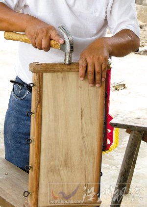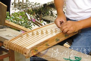 琴架制作 选取直径70厘米以上无疤痕的梧桐板,锯成2厘米厚的弧形薄板两块,一块为面板,一块为底板,水中浸泡若干天后,晾干刨平;取红硬木为琴边框架;框架两头拧上螺丝钉;上琴弦;最后在琴板和每条琴弦之间安一个竹码作填子,用于调节校音。琴架制作完成后,牛筋琴已基本成形,不过制作师傅还要对牛筋琴进行修整和调音,确保质量过关。此项工艺要求极高,制作师傅不仅要会圆木制作技艺,而且必须对温州鼓词的乐曲常识和牛筋琴的发音特点了如指掌。