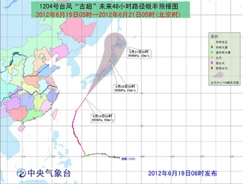 6月18日晚上今年第4号强台风 “古超”(Guchol)已于减弱为台风,6月19日05时其中心位于北纬28.5度、东经131.2度,就是日本国四国岛高知县南偏西方大约600公里的西北太平洋洋面上,台风“古超”中心附近最大风力有13级(40米/秒),台风“古超”中心最低气压为960百帕。