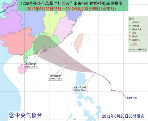根据气象部门预计,台风“杜苏芮”未来将以每小时25-30公里的速度继续向西偏北方向移动,穿过巴士海峡,预计在6月28日晚上进入南海东北部海面,并逐渐向我国广东沿海靠近,台风的强度还将继续加强,并将于6月29日晚上到6月30日上午在上述沿海登陆。