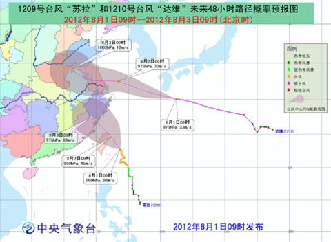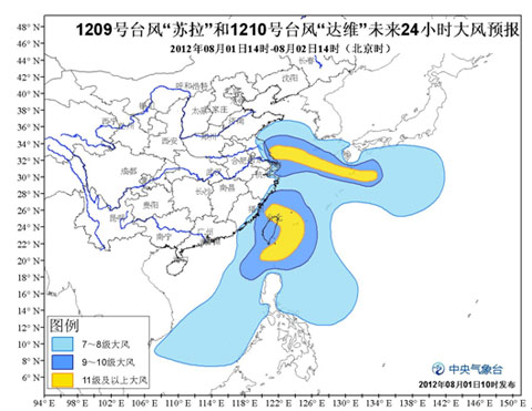 在8月1日傍晚前后,台风达维将进入东海东北部海面,然后向江苏南部到山东半岛南部一带沿海靠近,并将于2日傍晚到3日早晨在江苏启东到山东青岛一带沿海登陆。8月1日14时到8月2日14时,东海北部和黄海中南部海域以及山东半岛南部沿海、江苏沿海、长江口区、上海沿海将受第10号台风达维影响,将出现7-9级大风,台风达维中心经过的附近海域或地区的风力有10-12级,阵风可达13-14级。