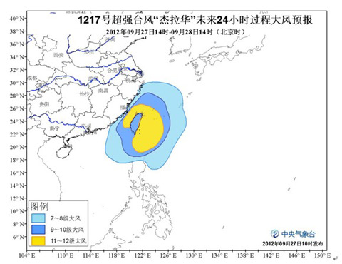 杰拉华的7级风暴圈半径达到320公里,我国东部沿海多地在未来几天将有大风和暴雨。受“杰拉华”和南下冷空气的共同影响,27日14时至28日14时,巴士海峡、巴林塘海峡、台湾以东洋面、南海东北部海面、台湾海峡、东海中南部海面以及台湾省沿海、福建沿海、浙江中南部沿海将有7-10级大风,阵风可达11-12级,部分海域或地区的风力有11-13级,阵风可达14-15级,“杰拉华”中心经过的附近海域的风力有14-17级,阵风可达17级以上;台湾东部和北部将有大到暴雨,部分地区有大暴雨或特大暴雨。