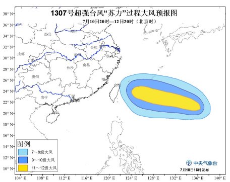 2013年7月10日下午6点,中央气象台发布今年第一个台风橙色预警:今年第7号超强台风苏力的中心距离温州1475公里的太平洋洋面上,具体位置在北纬21.8度,东经133.6度,苏力台风中心附近最大风力有16级,风速较下午5点的55米/秒稍有降低,目前为52米/秒,中心最低气压为935百帕,7级风圈半径380公里,10级风圈半径160公里。