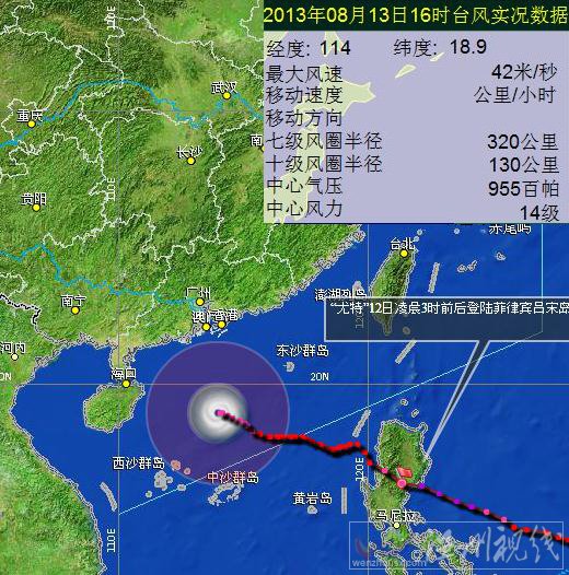 8月13日下午16时,台风尤特中心距广东沿海还有450公里左右,台风强度仍维持在14级(41米/秒)。受台风外围云系影响,14日至17日期间,湖南大部分地区将出现降雨,其中湖南东南部降雨量会较大。此次降雨将大大的缓解湖南旱情。