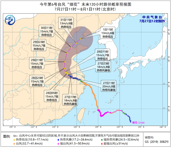 虽然它未来路径仍有不确定,但仍需关注台风“烟花”未来趋势及对华东、华北等地风雨影响和可能引发的山洪、地质灾害、中小河流洪水及城乡内涝等。