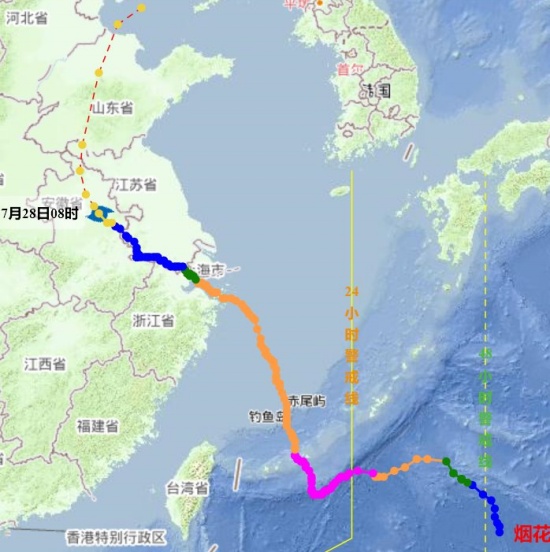 台风“烟花”目前高层气流对台风的引导还是比较明显。而28日东侧高压系统的变形,将是后期“烟花”路径是否从目前的西北方向转向东北方向的关键。目前来看,预计“烟花”今天夜里会进入安徽,明天上午改为偏北方向,29号上午进入山东后,改为东北行进。