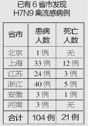 截至目前,全国共报告104例确诊病例,其中死亡21人,康复13人,其余70人正在各定点医疗单位接受救治。全国h7n9禽流感病例浙江省荣登榜首,和浙江省的防控反映迟钝有关系,上海市最早发现h7n9禽流感病例,江苏省曾经一度领先浙江省,上海紧急关闭活禽交易市场,接着南京紧急关闭活禽交易市场。上海南京都高度重视,切实做好h7n9禽流感防控措施,浙江杭州、湖州的活禽交易市场却没有关闭。结果,很快,浙江省h7n9禽流感病例就超过了上海市和江苏省。