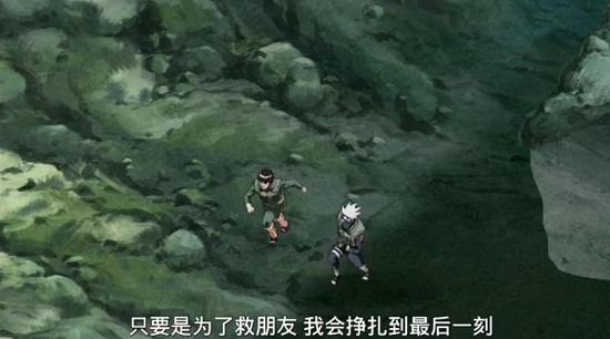 画面回到了现在,卡卡西眼睛受伤看不见还是和凯一起往前冲,他说:看不见可以听见,再不行还有嗅觉和触觉,只要是为了救朋友,我会挣扎到最后一刻......