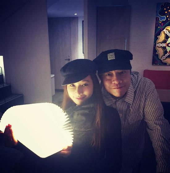 蔡康永微博晒和林志玲合照,炫耀志玲送自己的可折叠书灯:“志玲说这个是她特别为书呆子挑的礼物~~书打开,变成灯。”