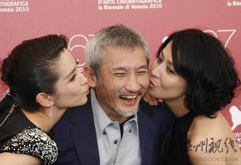 导演徐克笑得好开心,左右被刘嘉玲、李冰冰两个大美女热吻,能不开心吗?