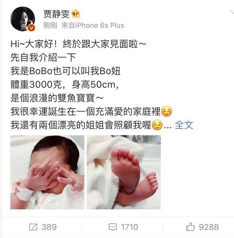 今日,贾静雯分享喜讯,称第三胎女儿已经出生。她用女儿的口吻写道:“Hi~大家好!终于跟大家见面啦~先自我介绍一下,我是BoBo也可以叫我Bo妞体重3000克,身高50cm,是个浪漫的双鱼宝宝~我很幸运诞生在一个充满爱的家庭裡我还有两个漂亮的姐姐会照顾我喔。”贾静雯老公修杰楷则发文:“Bo妞……欢迎加入,老爸已经准备好了。”