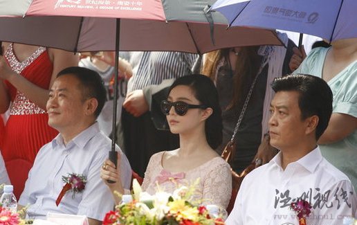 范冰冰当日身穿粉色蕾丝连衣短裙,在入场时并没有假他人之手,而是独自撑着一把大号的太阳伞进入会场。就座后虽然有一条围巾类的东西防止走光事件的发生,但是却暴露了范美人身材缺陷——粗壮的大腿。此外,还有助理在旁边为她擦拭一直流个不停的汗水。