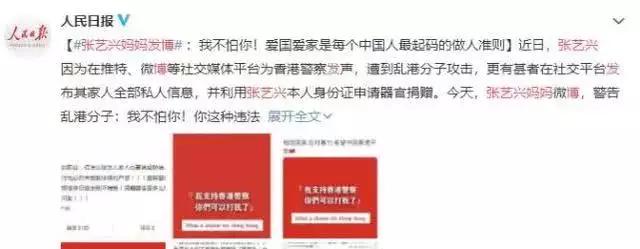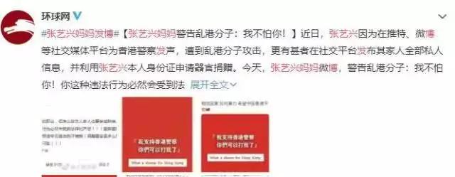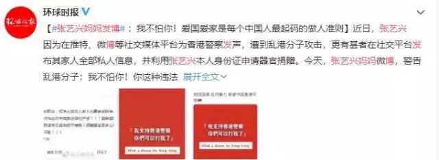 因此,8月27日晚,张艺兴妈妈发布微博警告乱港分子,“我不怕你!你这种违法行为必然会受到法律的严惩!爱国爱家是每个中国人最起码的做人准则,我们做该做的,没想谁夸但谁也别吓唬我!”↓