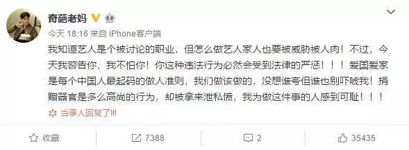 更为过分的是,这位网友还称张艺兴为“支那明星”, 众所周知,这个称呼是带有侮辱的含义。对于这样的情况,张艺兴的妈妈主动发声,通过社交平台发文谴责这一行为,“我知道艺人是个被讨论的职业,但怎么做艺人家人也要被威胁被人肉!不过,今天我警告你,我不怕你!”
