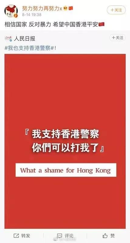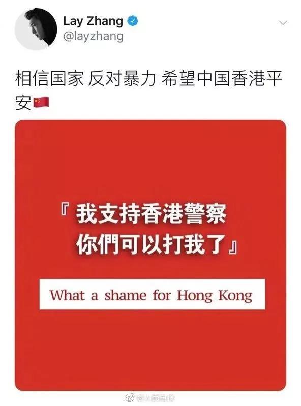 事情是这样的:近日,不少内地艺人就香港乱局接连发文,力挺香港警察。8月14日,张艺兴就在推特、微博、Instagram等社交媒体平台发布“我支持香港警察,你们可以打我了”一图,为港警发声。↓