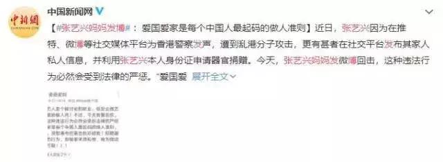 张艺兴力挺港警遭乱港分子攻击,更有甚者利用张艺兴本人身份证申请器官捐赠。张艺兴妈妈发博:“你这种违法行为必然会受到法律的严惩!”