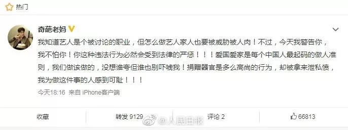 张艺兴妈妈微博发出后,得到网友的力挺。↓