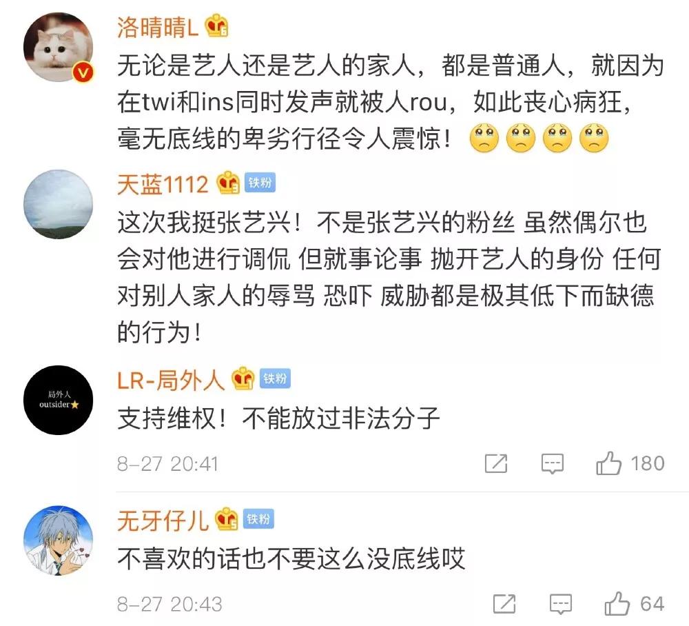 网友们也纷纷表示:“家人是底线!必要时报警处理吧!”“生而为人,请善良。”“好人一生平安,支持张艺兴”“支持艺兴,严惩恶徒”“真是太无语”。
