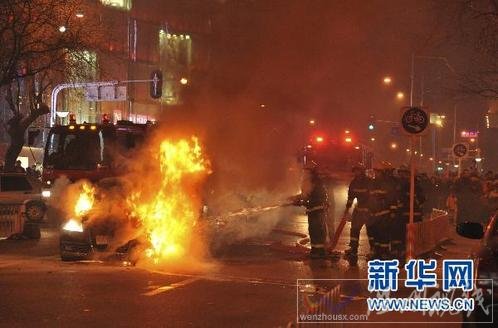 2010年12月17日晚,在北京王府井,被肇事车辆倒车撞坏的“军A”牌照轿车起火燃烧。新华社发(李文明 摄)当日,北京王府井附近两车相撞致一车发动机着火,火势随后被扑灭,未造成人员伤亡。