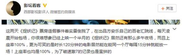 微博认证西部影视影评人为的网友“影坛看客”曝捉妖记票房造假:截图举例说明,《捉妖记》在某些场次,明明已经爆满,却又在15分钟后,开售同一影厅的电影票,甚至在观影人次稀少的午夜场,经常也会无故爆满,明显是票房造假。